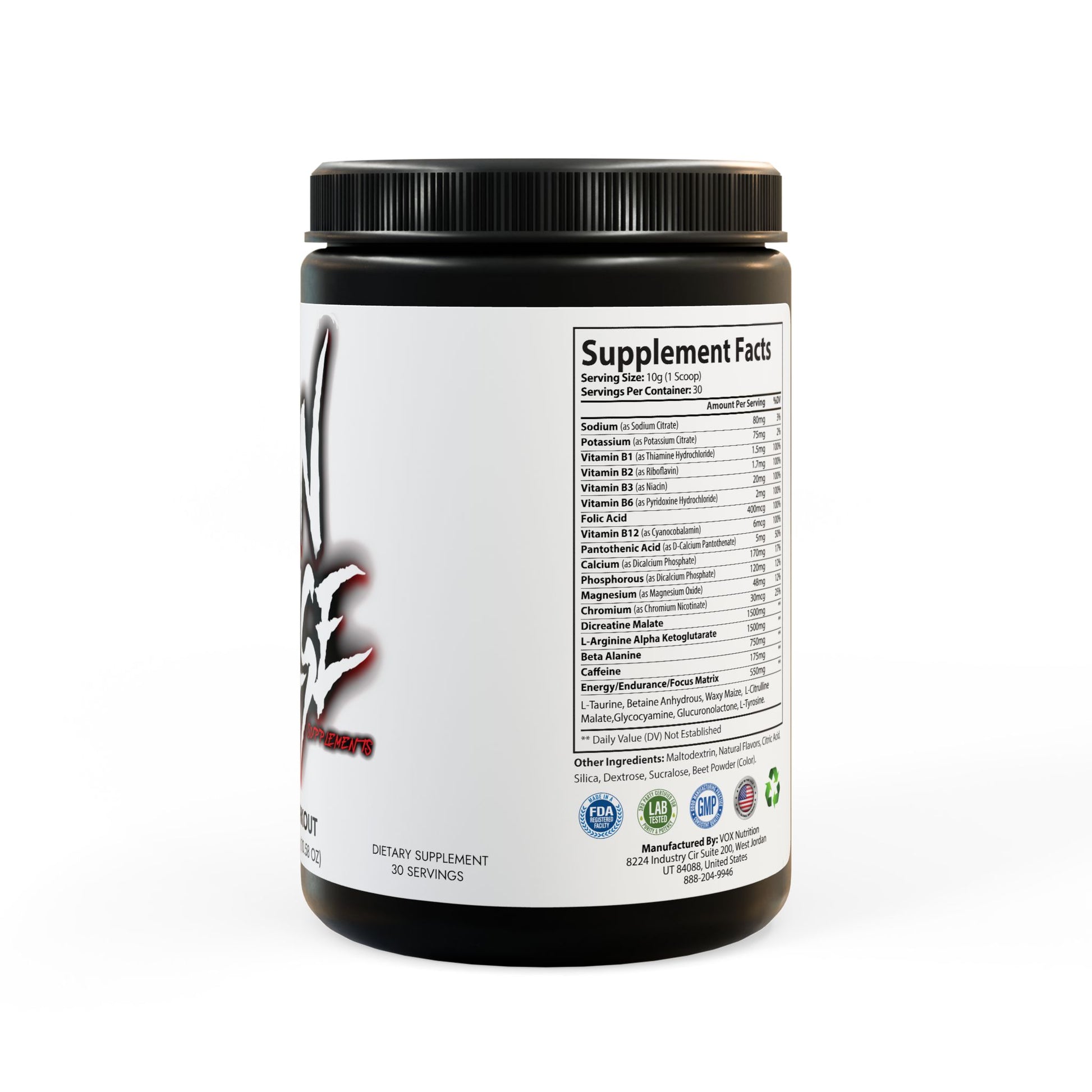 Ingredients: Sodium (as Sodium Citrate), Potassium (as Potassium Citrate), Vitamin B1 (as Thiamine Hydrochloride), Vitamin B2 (as Riboavin), Vitamin B3 (as Niacin), Vitamin B6 (as Pyridoxine Hydrochloride), Folic Acid, Vitamin B12 (as Cyanocobalamin), Pantothenic Acid (as D-Calcium Pantothenate), Calcium (as Dicalcium Phosphate), Phosphorous (as Dicalcium Phosphate), Magnesium (as Magnesium Oxide), Chromium (as Chromium Nicotinate), Dicreatine Malate, L-Arginine Alpha Ketoglutarate, Beta Alanine, Caffeine, L-Taurine, Betaine Anhydrous, Waxy Maize, L-Citrulline, Malate ,Glycocyamine, Glucuronolactone, L-Tyrosine. Other Ingredients: Maltodextrin, Natural Flavors, Citric Acid, Silica, Dextrose, Sucralose, Beet Powder (Color).